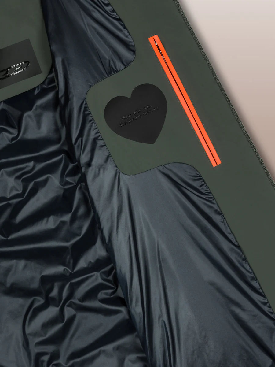 This mid-season sleeveless jacket is available in understated shades brought by the sea. It easily completes an informal shirt, or a crew-neck sweater in casual leisure and weekend outfit. Its design is defined by the slim padding and the metal zipper at the front, which rises up to close the vertical collar fitted with a service hood. The invisible zipped side pockets are joined by the inside breast pocket enlivened by the fluo orange double welt and the signature heart-shaped tag "Made with love, designed in Tuscany