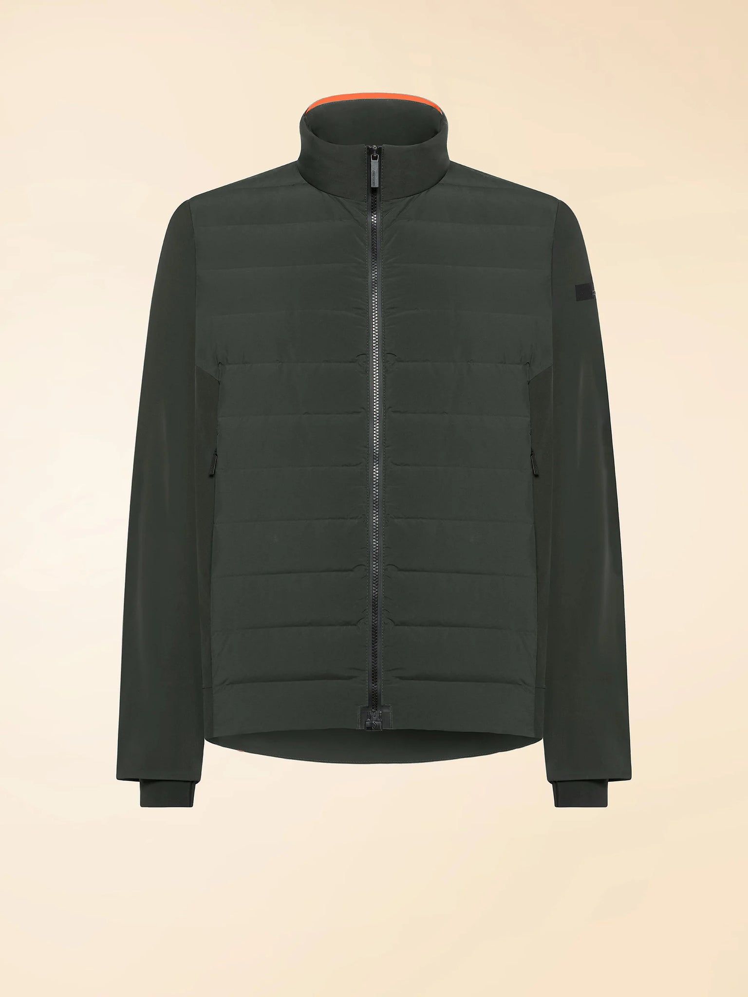 This outerwear jacket is designed to playfully embrace the unpredictable changes of the seasons. It stands out for its clean design and hybrid construction that combines stylish elegance with practicality. Seamless tubic channels protect the torso with eco-friendly duck down padding that provides high thermal power, offering warmth and comfort in a minimalist silhouette. The long sleeves have a super matte finish, creating a refined contrast of textures that highlights the garment's contemporary character. The front zipper with magnetic hooking and side pockets with invisible zippers complete the design. Distinctive details, such as the bright orange welt on the back hem, the inner "Made with love, designed in Tuscany" tag and the black micro-injected logo on the left sleeve, define a jacket with an authentic, highly recognizable style.